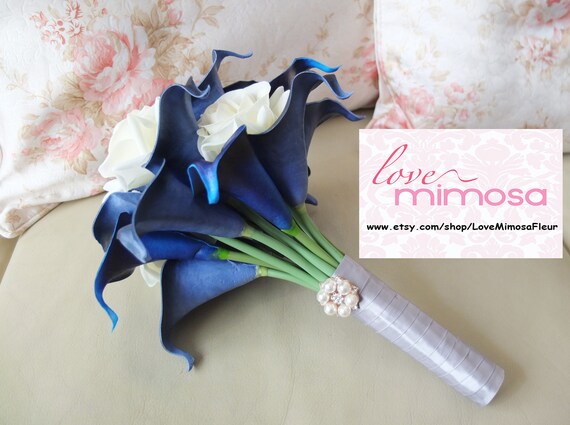 Wedding Bouquets Navy Calla Lily And Ivory Roses Bouquet Etsy