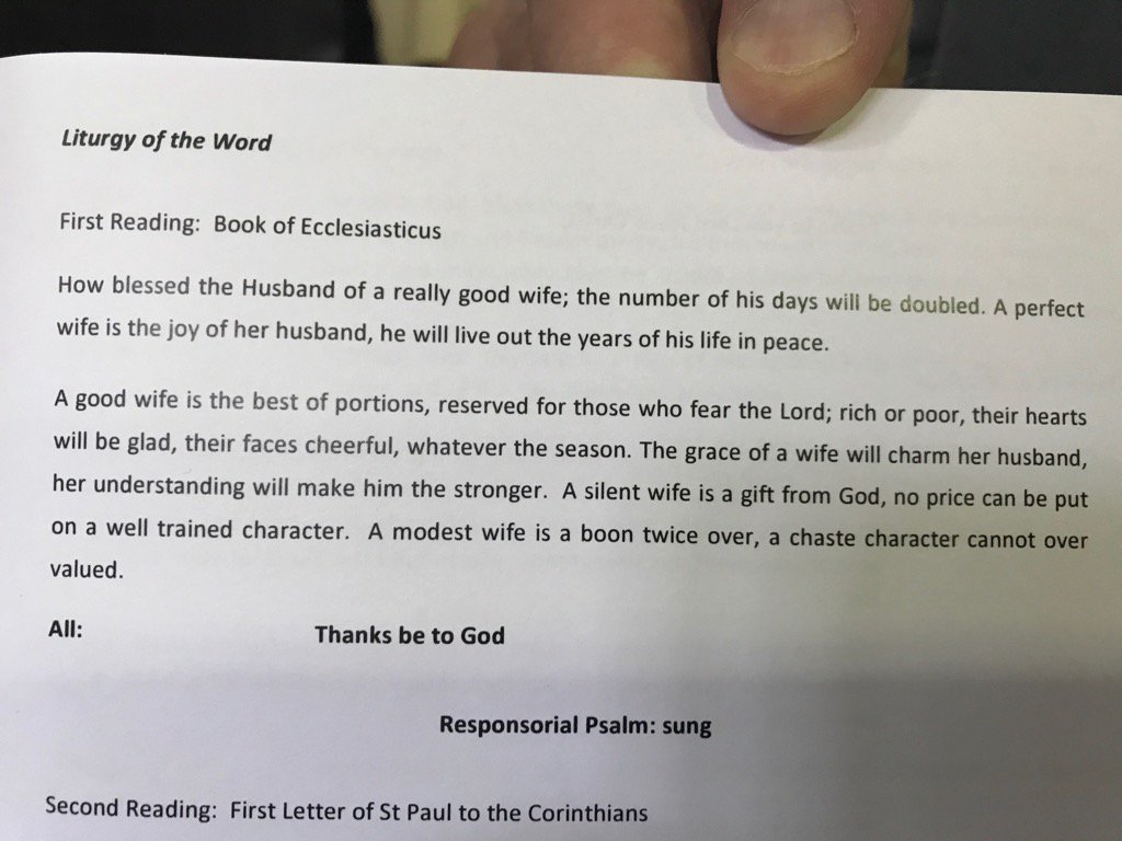 Peter Casey On Twitter A Reading At My Niece S Wedding A Silent Wife Is A Gift From God I Am Back Reading The Old Testament